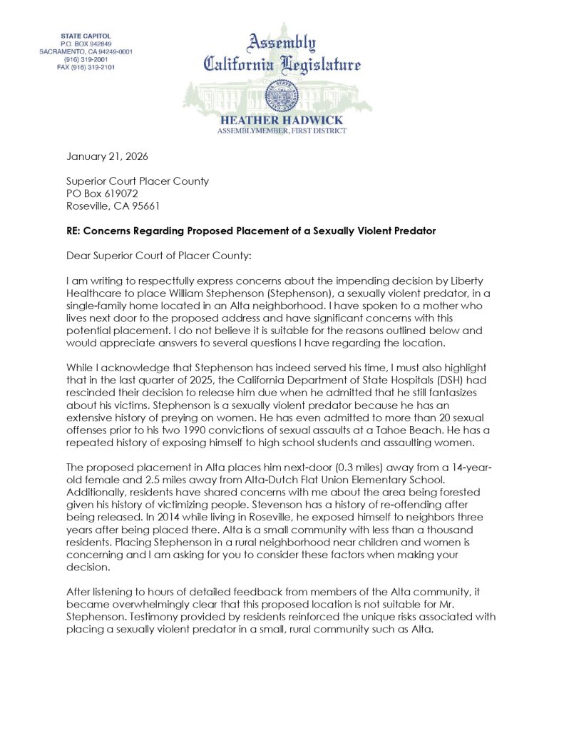 Next Post Assemblywoman Hadwick Condemns State Plan to Place Sexually Violent Predator in Alta, Calls Decision Reckless and Dangerous