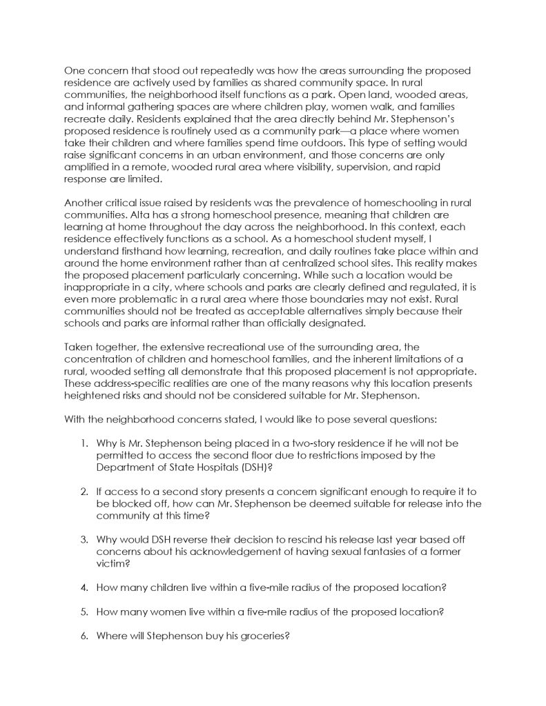 Concerns Regarding Proposed Placement of a Sexually Violent Predator